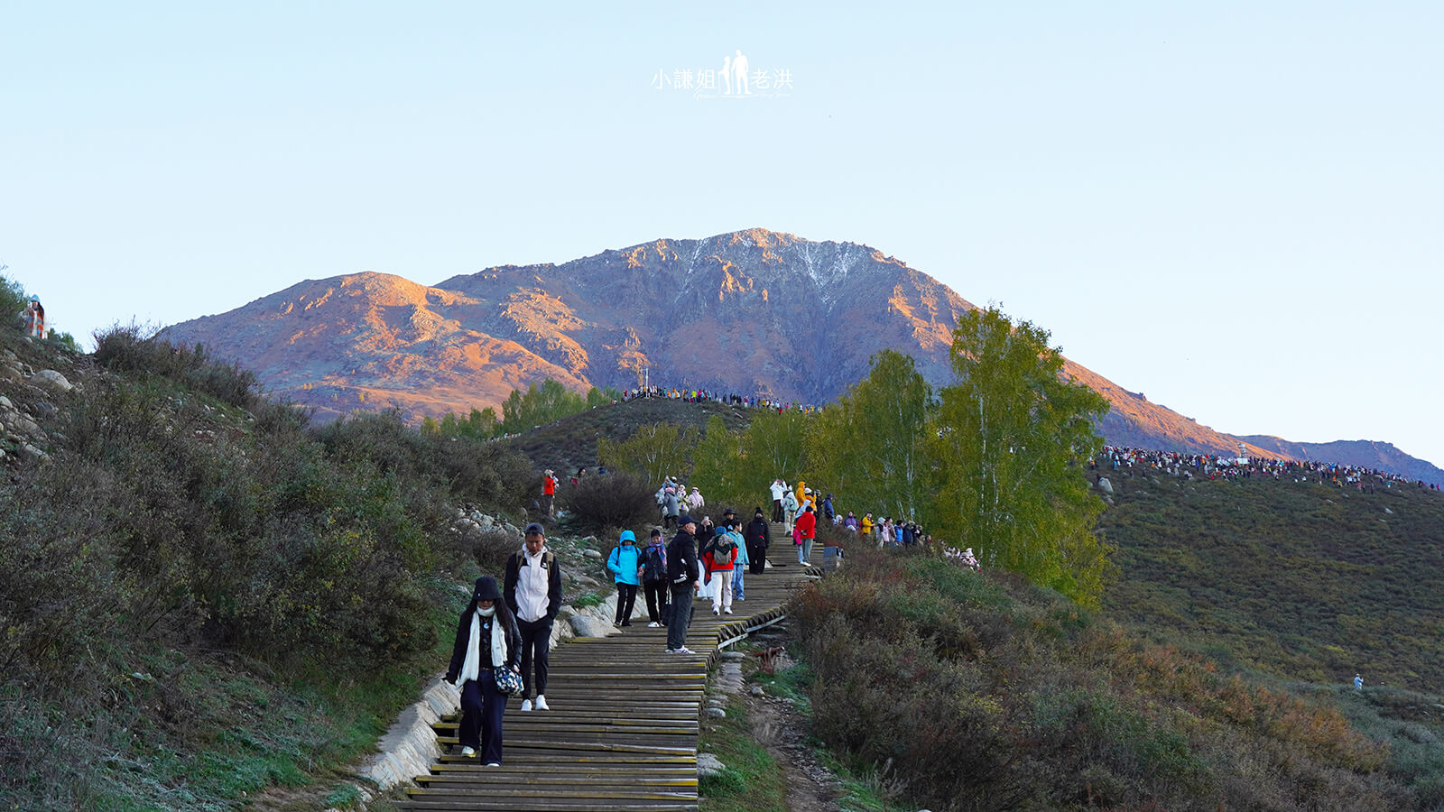 走著走著回頭驚見滿山頭的遊客,還有紅通通的日照金山。