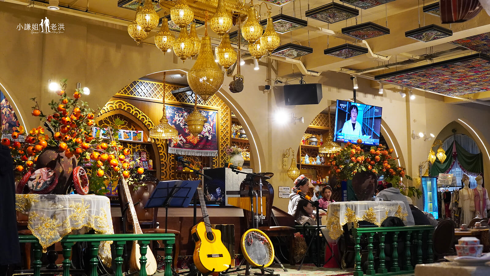 逛著逛著就到了午餐時間,這家深具新疆異域特色的茶餐廳,無論是環境、服務與餐點都非常優秀,更有賞心悅耳的駐唱表演,可惜我們去的時間太早,他們剛剛開始營業一切都還在準備中,特色久燉河魚必點,有時間的話推薦大家前來聽歌用餐。
