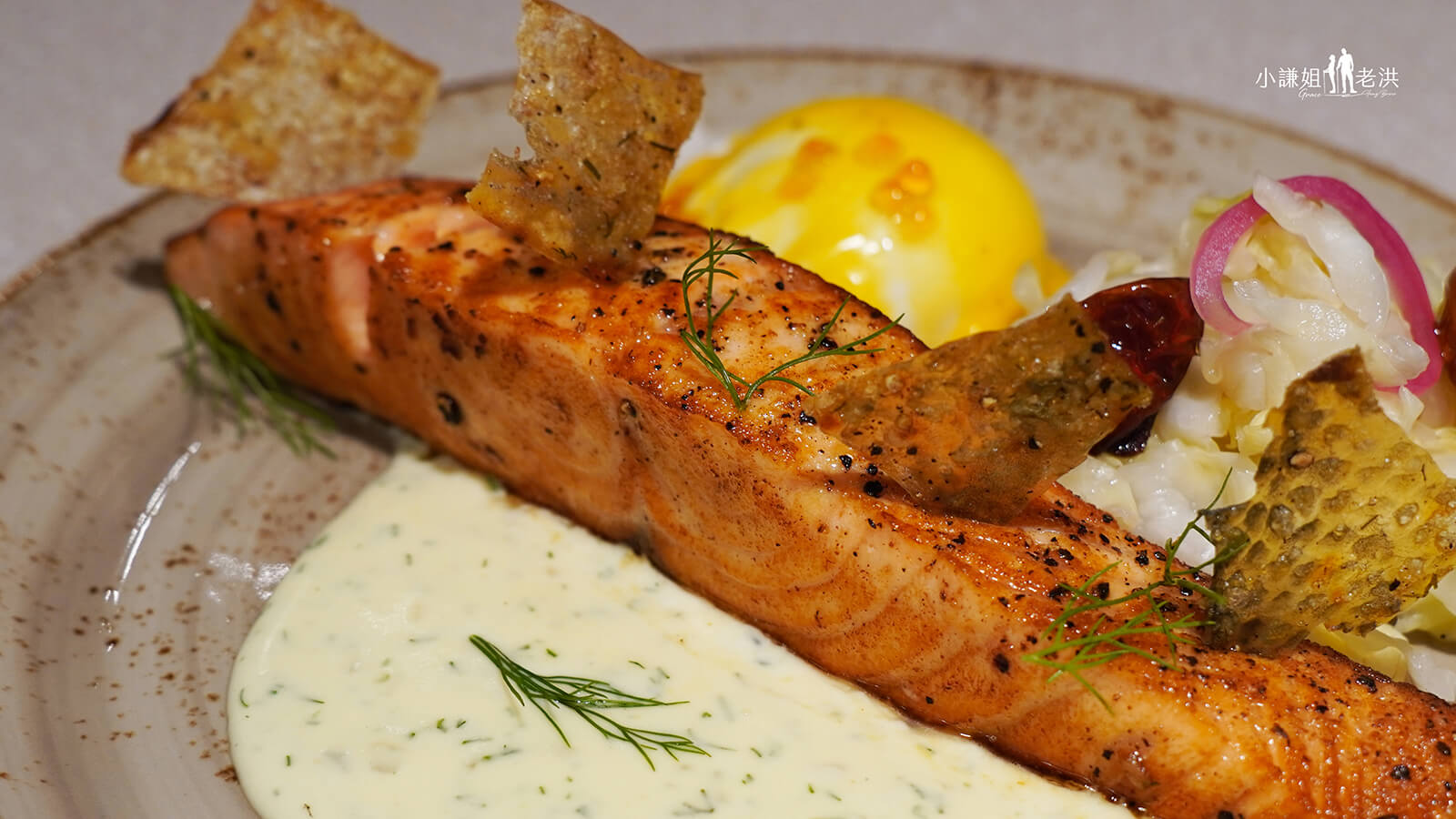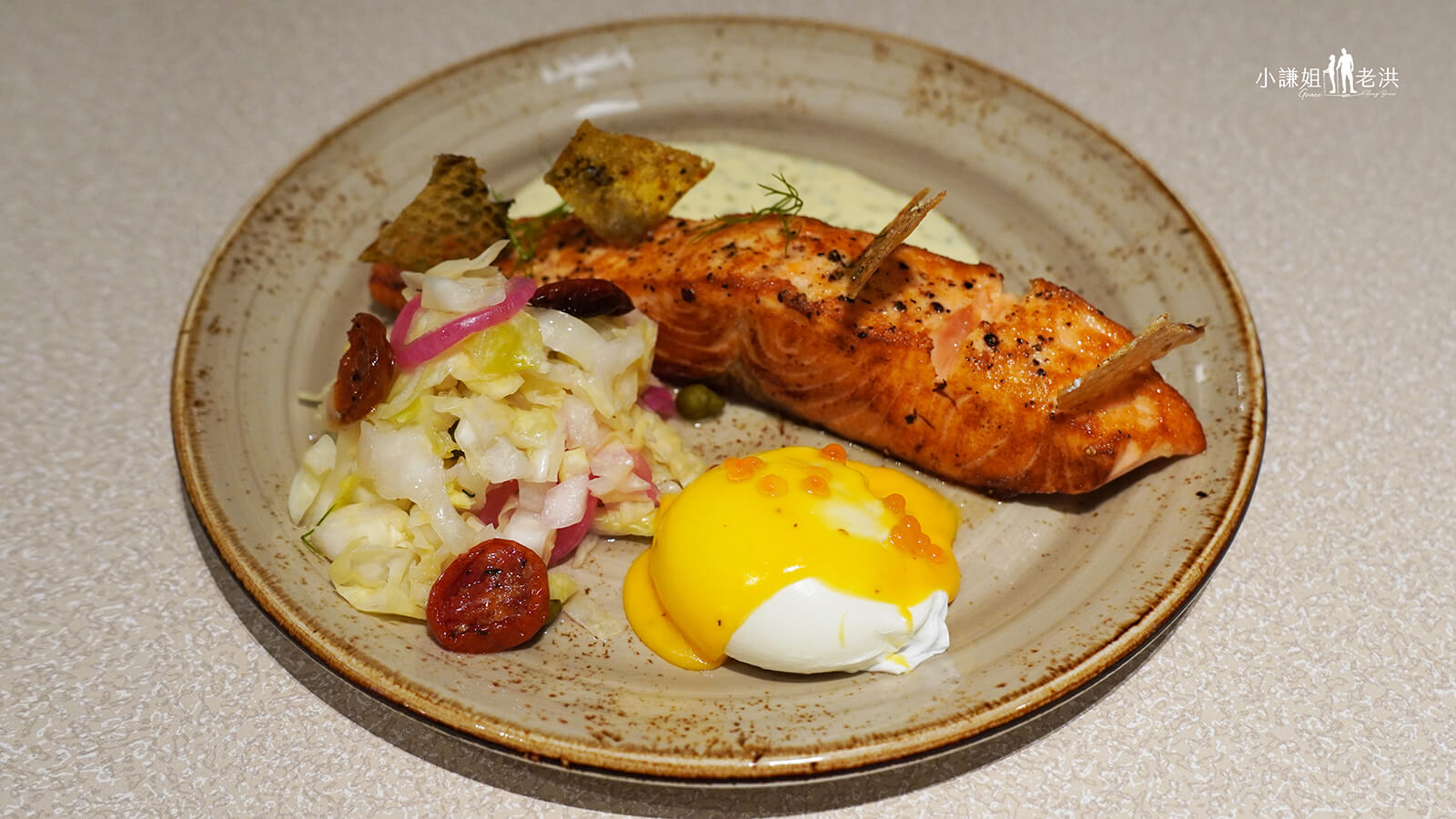 煎得外酥裡嫩又多汁的鮭魚,搭配蒔蘿奶油醬非常爽口解膩,上面烤得酥香的魚皮增加豐富的口感層次,荷蘭醬佐上濃郁蛋汁的水波蛋多了幾許酸香,搭配鮭魚一起非常鮮香好吃,唯獨在味覺上比較無法融入一起的,只有旁邊的醃製包菜,過酸的味道有些突兀。