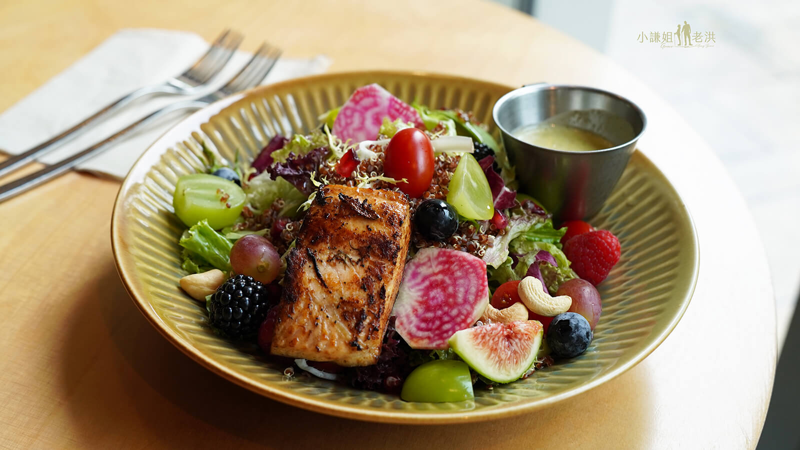 材料:綜合生菜、時令水果、牛油果、蒔蘿油醋汁、醃製三文魚(鮭魚)、腰果、藜麥