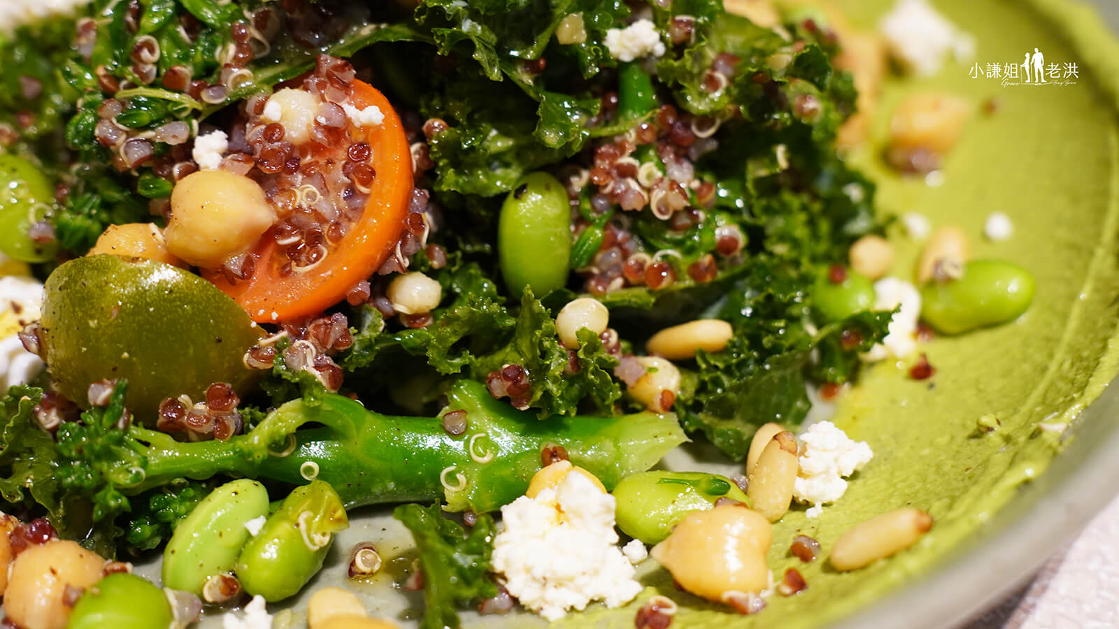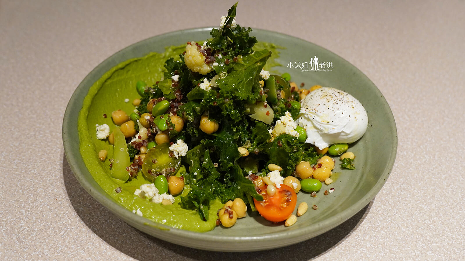 材料:羽衣橄欖、小麥仁、藜麥、鷹嘴豆、聖女果、烤南瓜、寶塔菜、毛豆、花菜、西蘭苔、橙汁油醋汁、水波蛋、手工芝士、鷹嘴豆泥(混合菠菜汁)